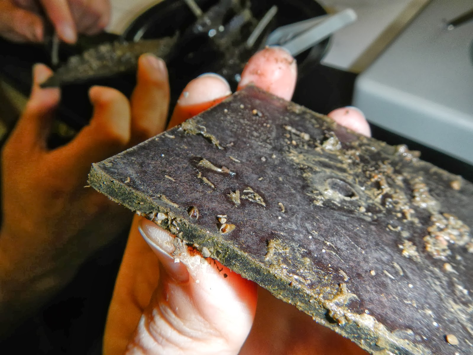 When a flagged brick with samplers attached was found, the brick was removed from the water first and carried toward the location of the samplers. It was important to have a Ziploc bag ready before taking the samplers out of the water because organisms tend to drop-off once the samplers are removed. Each sampler was placed in its own Ziploc bag and then all the samplers and the attached brick were placed in a garbage bag.